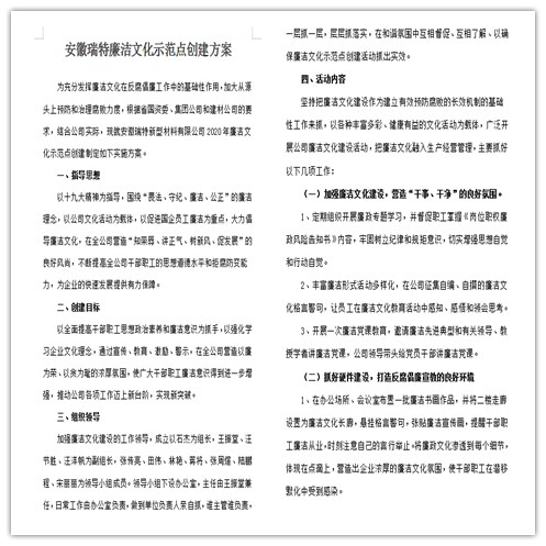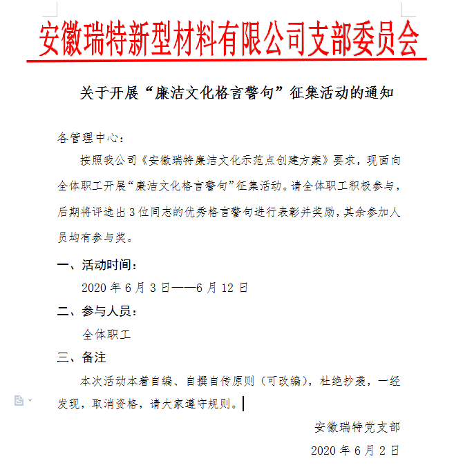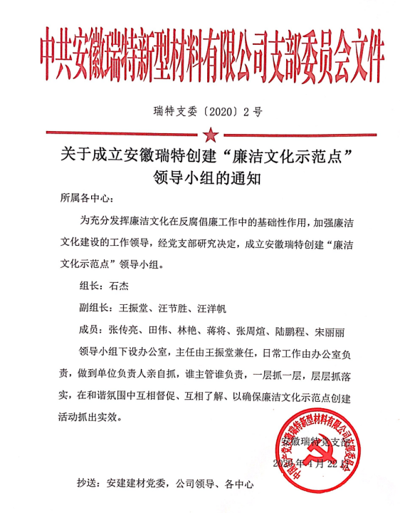 為進一步規(guī)范生產(chǎn)經(jīng)營管理,強化廉潔意識,充分發(fā)揮企業(yè)文化在公司發(fā)展中的引領作用。安徽瑞特依據(jù)2020年度目標任務,結合生產(chǎn)經(jīng)營特點,自今年4月中旬以來,扎實開展了 “廉潔文化示范點”創(chuàng)建工作。