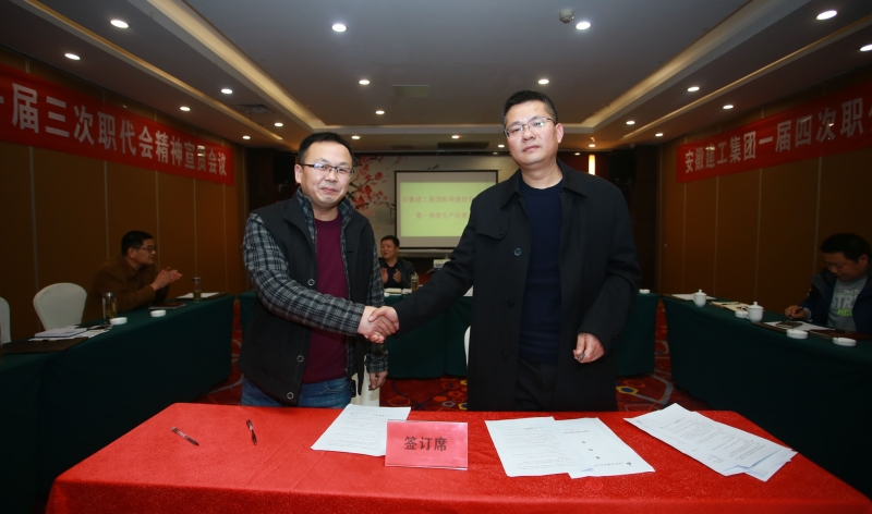 會議首先對安徽建工集團一屆四次職代會精神及安建建材一屆三次職代會精神進行了宣貫。蚌埠建材黨支部書記、總經理陶良敬重點解讀了《蚌埠建材2018年總經理工作報告》內容,并與各中心負責人簽訂了《年度安全目標責任書》。