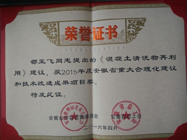 《混凝土清洗物再利用》榮獲“2015年度安徽省重大合理化建議和技術(shù)改進成果項目獎”
