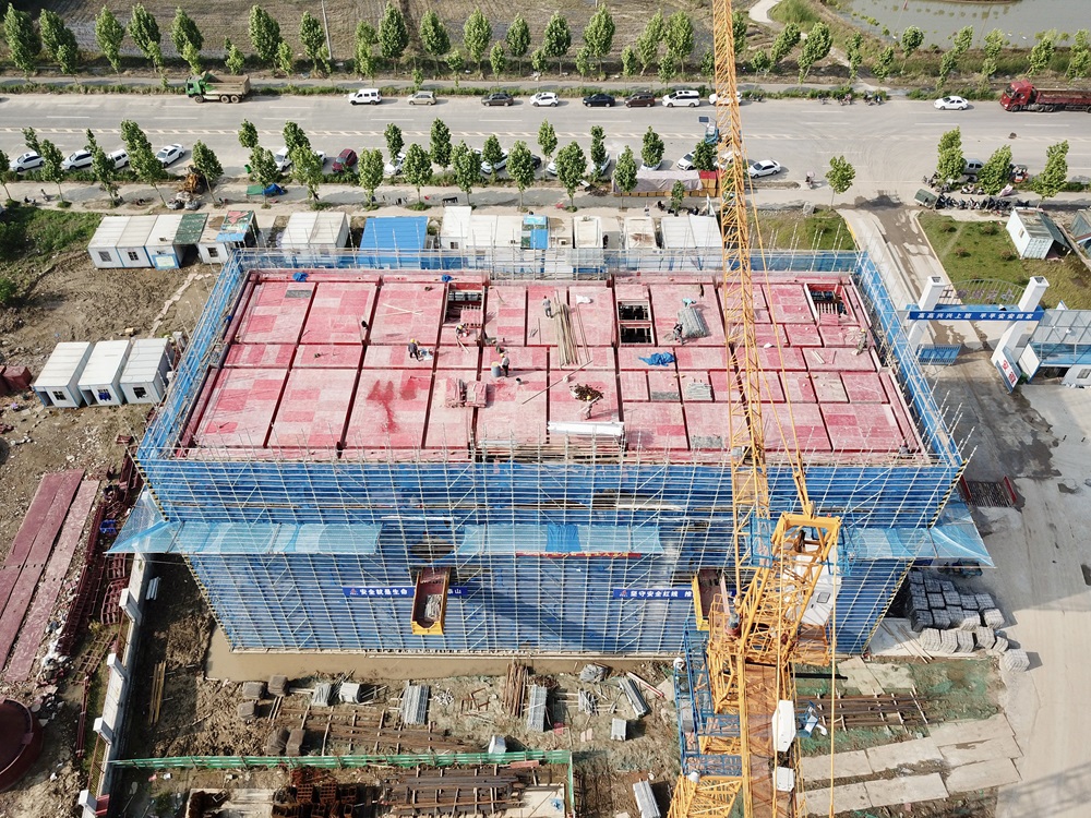 技術研發(fā)樓完成第四層主體結構施工,正在進行五層梁底板、頂板鋪設;