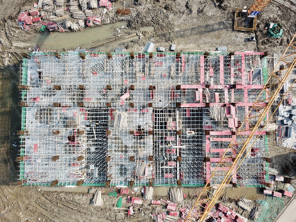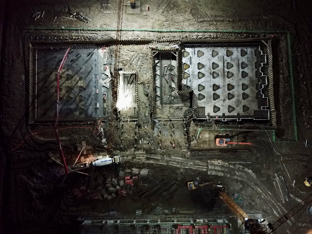 2#廠房正在進行高倉東區(qū)承臺筏板澆筑施工,西區(qū)及中區(qū)廊道處組織班組加班加點進行承臺鋼筋綁扎;