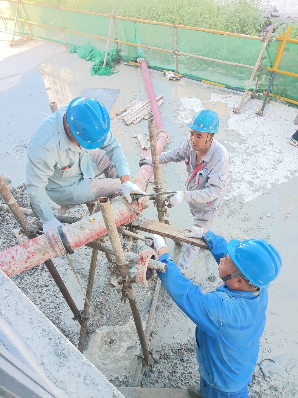 施工現(xiàn)場(chǎng)2:蚌埠建材泵送班組人員正在烈日下布泵,保障現(xiàn)場(chǎng)澆筑