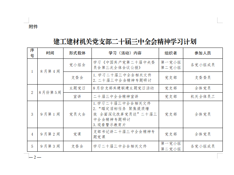 全面系統(tǒng)學。根據(jù)上級黨委要求,結合支部實際,精心制定《建工建材機關黨支部二十屆三中全會精神學習計劃》,堅持“周周有動作”原則,借助“三會一課”“主題黨日”等學習載體,有序推進全會精神學習走深走實。