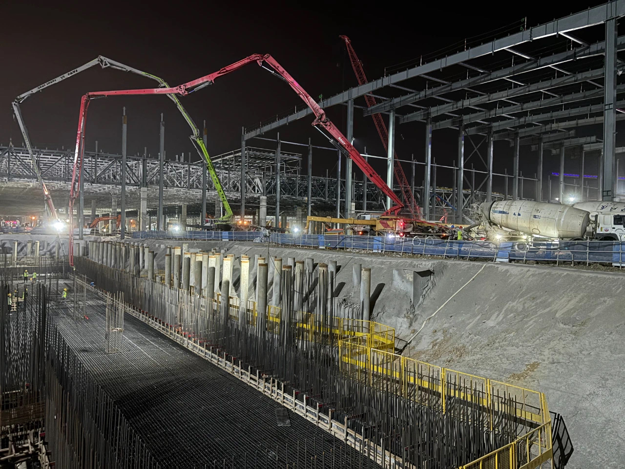 合肥大眾項(xiàng)目是集團(tuán)重點(diǎn)工程項(xiàng)目,也是智慧化建材科技園的生動(dòng)實(shí)踐。建工建材在接到13000多方大體量混凝土澆筑任務(wù)后,高度重視,迅速行動(dòng),召開(kāi)專題會(huì)議制定詳細(xì)的保供方案和應(yīng)急預(yù)案,組織安徽瑞特、擎工建材、新途建材三站協(xié)同,對(duì)物流進(jìn)行優(yōu)化舉措,強(qiáng)化調(diào)度,攪拌車和泵車在統(tǒng)一指揮下快速到位,140輛罐車,13臺(tái)泵車連續(xù)作業(yè)28小時(shí),比預(yù)定計(jì)劃提前8小時(shí)完成澆筑任務(wù)。澆筑期間,參戰(zhàn)單位及工地現(xiàn)場(chǎng)施工人員各司其職,強(qiáng)化調(diào)度提升了車貨匹配效率,降低運(yùn)輸成本,節(jié)約運(yùn)輸時(shí)間,展示出更強(qiáng)大的保供能力,得到參建各方的一致好評(píng),樹(shù)立了良好的品牌形象。