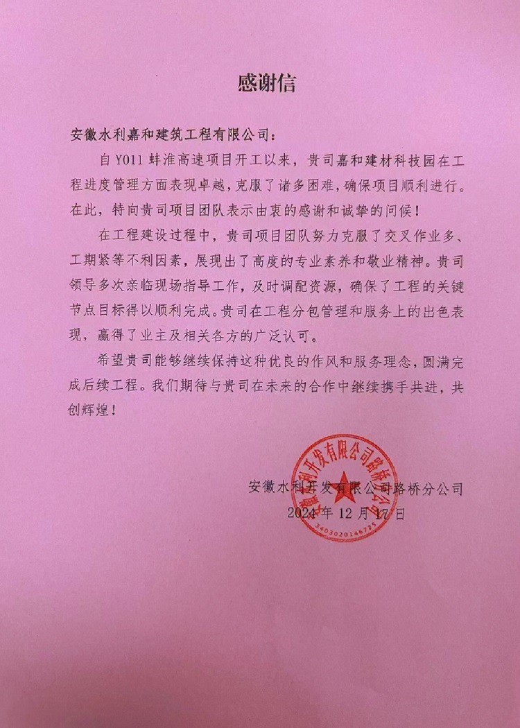 近期,嘉和建材科技園順利完成Y011蚌淮高速項目路面瀝青攤鋪施工主體任務。12月17日,嘉和建筑再次收到業(yè)主表揚信,對Y011蚌淮高速項目施工進度、施工質量及項目團隊表示充分肯定,對項目部在過程中展現(xiàn)出的良好工作作風表示高度贊賞和肯定。