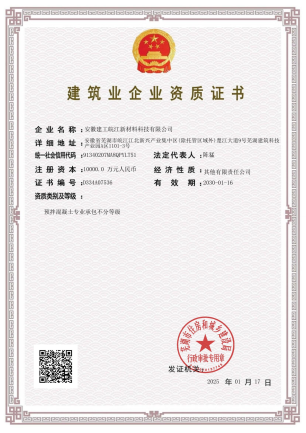 喜報!安徽建工皖江新材料科技有限公司取得預(yù)拌混凝土專業(yè)承包資質(zhì)