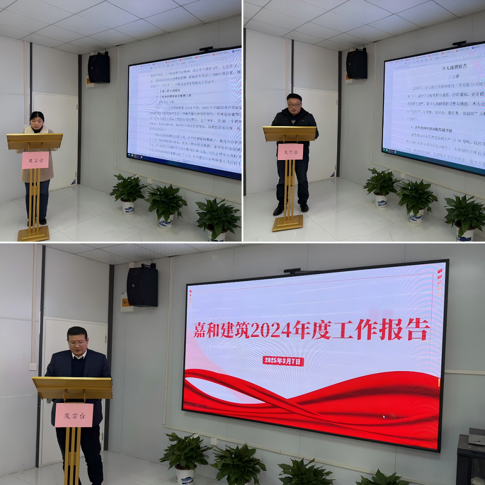 會上嘉和建筑領導班子及中層管理人員進行現(xiàn)場述職,嘉和建筑負責人王朝輝作了2025年度工作報告。