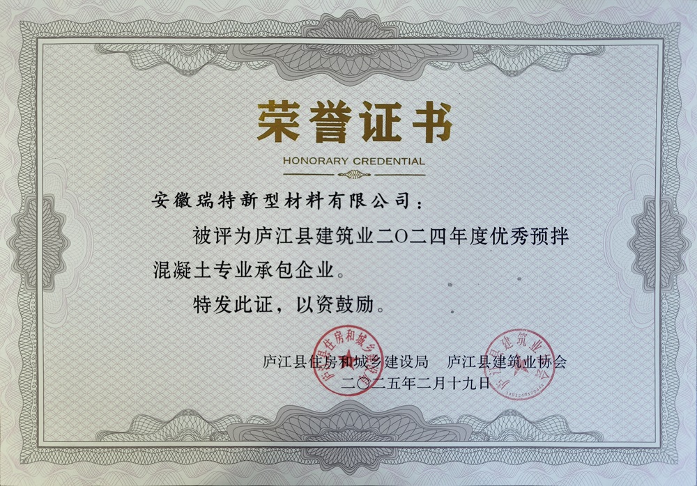 安徽瑞特新型材料有限公司,憑借其在技術(shù)創(chuàng)新、綠色發(fā)展和社會責(zé)任等領(lǐng)域的卓越成就,再次榮獲“廬江縣建筑業(yè)2024年度優(yōu)秀預(yù)拌混凝土專業(yè)承包企業(yè)”殊榮。