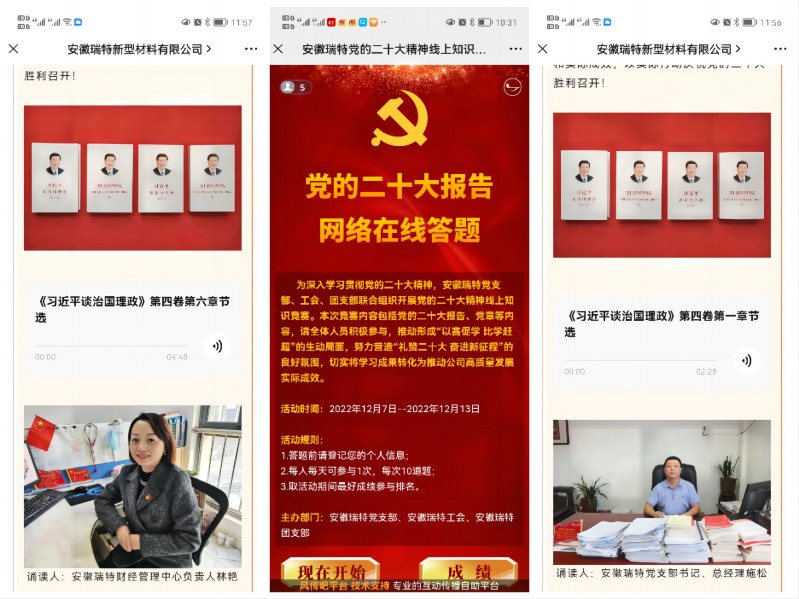 堅(jiān)持原原本本學(xué),促學(xué)深悟透“黨味”純。在二十大召開期間,安徽瑞特黨支部第一時(shí)間組織同大站及新途站人員觀看二十大開幕直播,認(rèn)真聆聽習(xí)近平總書記報(bào)告。通過“三會(huì)一課”第一時(shí)間研讀黨的二十大報(bào)告,既注重從總體上全面把握,又分專題分領(lǐng)域深刻領(lǐng)會(huì)。征訂《黨的二十大報(bào)告學(xué)習(xí)輔導(dǎo)百問》《二十大黨章修正案學(xué)習(xí)問答》等黨的二十大精神輔導(dǎo)用書共計(jì)100套,讓學(xué)習(xí)黨的二十大精神成為黨員干部政治思想的“充電站”、理論知識(shí)的“補(bǔ)給站”。