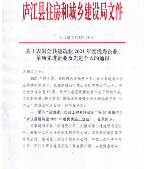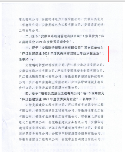 7月5日廬江縣住房和城鄉(xiāng)建設局公布廬住建【2022】58號文件《關于表彰全縣建筑業(yè)2021年度優(yōu)秀企業(yè)、單項先進企業(yè)及先進個人的通報》。在表彰中授予“安徽瑞特新型材料有限公司”等9家單位為“廬江縣建筑業(yè)2021年度優(yōu)秀預拌混凝土專業(yè)承包企業(yè)”。